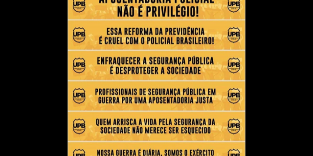 A União dos Policiais do Brasil (ASPEC-GO e ABC) informa aos profissionais de segurança pública que, até o presente momento, o comunicado feito pela Presidência da República, por meio de seu porta-voz, não apresentou qualquer melhoria na proposta de aposentadoria. Ao contrário, apresenta proposta piorada ao que já existe no relatório da Comissão Especial da Câmara dos Deputados. A UPB reitera seu compromisso de não aceite DA PIOR APOSENTADORIA POLICIAL DO MUNDO. Conclama todos os PERITOS CRIMINAIS E MÉDICOS-LEGISTAS para comparecerem dia 02/07, às 13 horas, em frente ao Congresso Nacional.